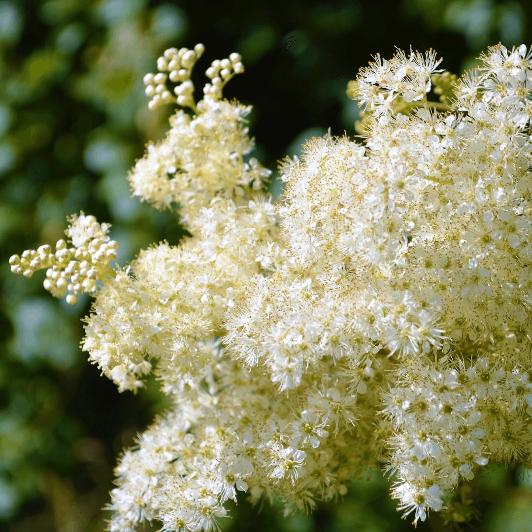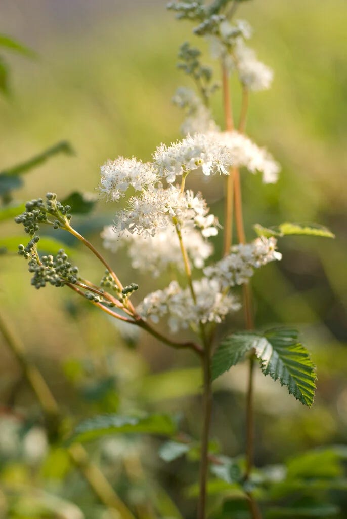 By midsummer, it’s a different creature entirely. Tall, elegant stems topped with frothy, cream-white flowers, like champagne bubbles that turned into blossoms. The scent is curious: sweet and heady, with an undercurrent of medicine cabinet, honey mingled with antiseptic. You notice it before you see it, drifting on the air in damp meadows and along riverbanks.